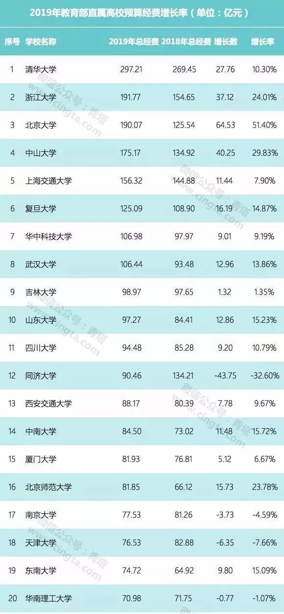 以2019年教育部部属高校经费预算为例。预算排名前10的高校,中西部只有西安交大、川大和吉林大学,其余7所皆为东部高校;前20名中,中西部高校仅占6席。预算50亿以上的中西部高校有9所,而东部有20所。中西部省份部属高校数量是东部的2倍,但东部高校预算是中西部的2倍,差距一目了然。