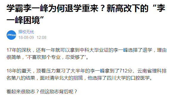 从中科大退学的大三学生李一峰。来自云南一个普通的农村家庭,拿到中科大录取通知书的第二天,他才知道,这所从前听说不错的高校原来不在北京在安徽。面对所报的环境科学专业,他毫无兴趣,最终选择退学重考。2018年以云南省理科第八名的成绩,考取四川大学口腔医学(五年制)专业。