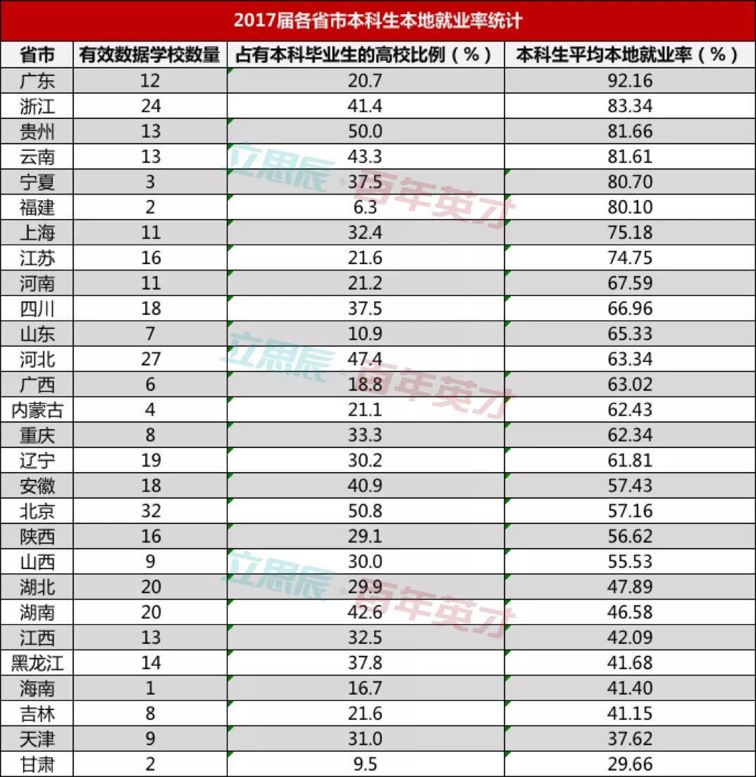 其中,广东、浙江、贵州、云南、宁夏排名前5。粤浙两省,是因经济发达,就业机会多,对毕业生吸引力强。而贵、云、宁三省份,则是本地生源居多,毕业生竞争力较弱,前往异地就业较少。排名靠后的省份中,甘肃、吉林、黑龙江等省份,由于经济下滑,难以留住毕业生。而两湖则受到广东等地区的人才吸附效应。