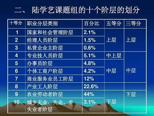 2002年,社会学家陆学艺领衔发布了《当代中国社会阶层研究报告》。该报告以职业分类为基础,按照占有的资源状况为依据,将中国社会划分为十大阶层:国家与社会管理者阶层、经理人员阶层、私营企业主阶层、专业技术人员阶层、办事人员阶层、个体工商户阶层、商业服务业员工阶层、产业工人阶层、农业劳动者阶层、城乡无业失业半失业者阶层。