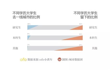 数据揭示:越是高学历的大学生,留在本地的比例越低、去往一线城市的比例越高。其中,超过30%重点大学的学生选择了前往一线城市;而非重点大学研究生前往一线城市的比例不到20%,本科生的比例仅为4%。(2017年ofo小黄车发布的《八城市大学生就业流向报告》)